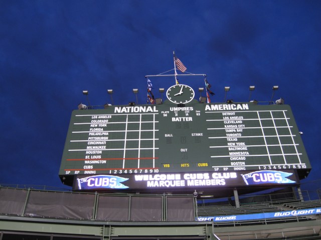 Wrigley Field is the one of the last ballparks to use a manually operated scoreboard (Fenway Park being the other). The scoreboard was installed in 1937 when the new bleachers were installed. It is still the original scoreboard that is present and has only seen a few minor changes throughout its history; clock was added in 1941, addition of the 5th and 6th score lines, in 1988 lights facing the scoreboard were added with the addition of night games and finally an electronic message board. Since Wrigley is a registered landmark, the scoreboard cannot be moved.