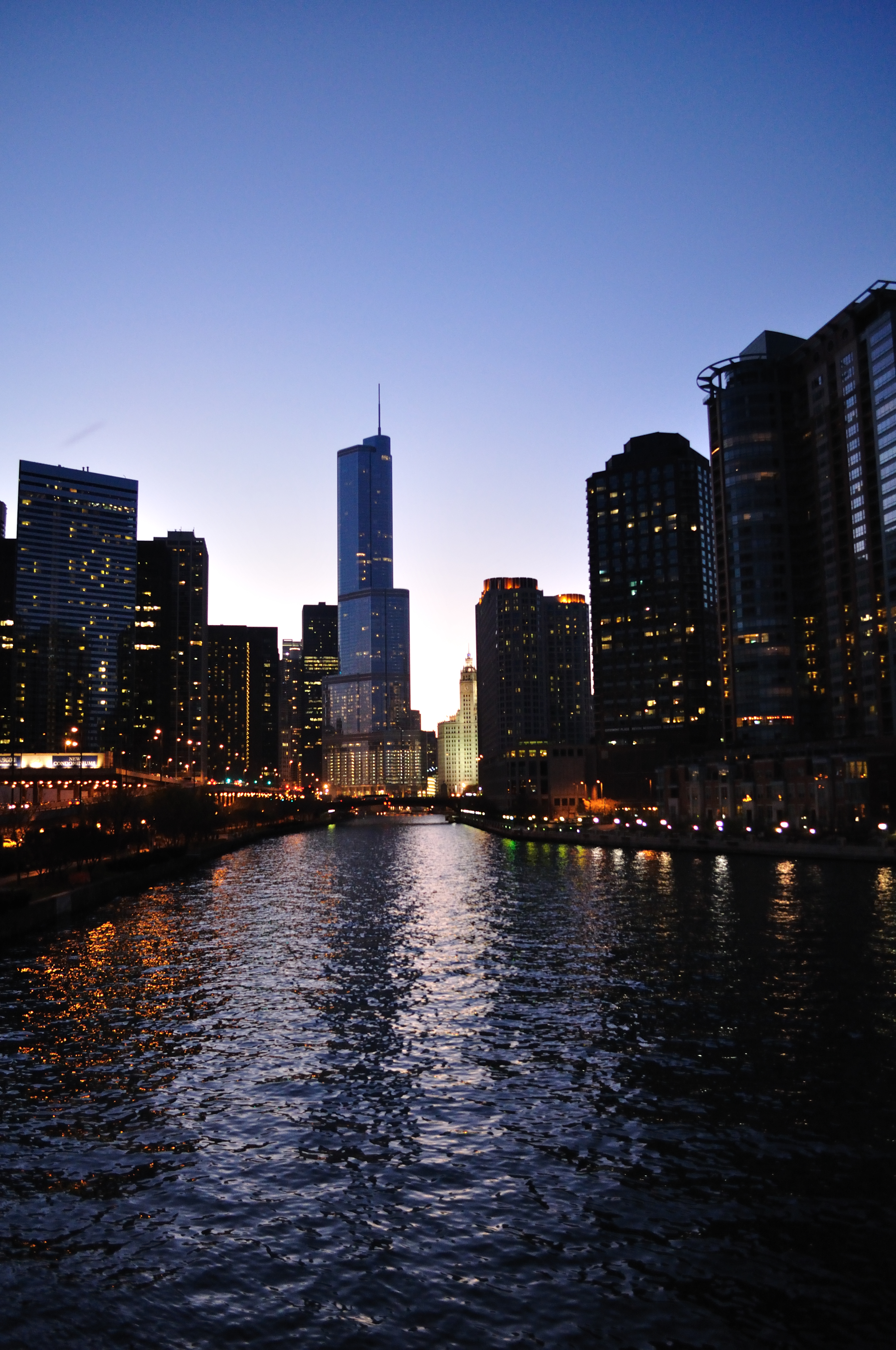 View of the Wrigley Building and Trump Tower from Lower Wacker Drive. What a beautiful night… the lights reflecting off the water and a clear night sky. Such a great view that is somewhat hard to capture as you drive down lakeshore drive.
