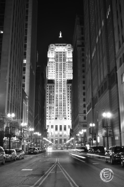 Taken standing in the middle of LaSalle street, looking at the Chicago Board of Trade (CBOT) building. The CBOT building was built in 1930 and was designated a Chicago Landmark in 1977, a National Historic Landmark in 1978 and was added to the National Register of Historic Places in June 1978. Atop the building stands a three-story art deco statue of Ceres, goddess of agriculture (particularly grain) holding a sheaf of wheat in her left hand and a bag of corn in her right. Falling behind in the construction of this sculpture, the designer John H Storrs decided to skip adding a face onto her since he thought that no other buildings would ever be tall enough to notice… I guess he was wrong.