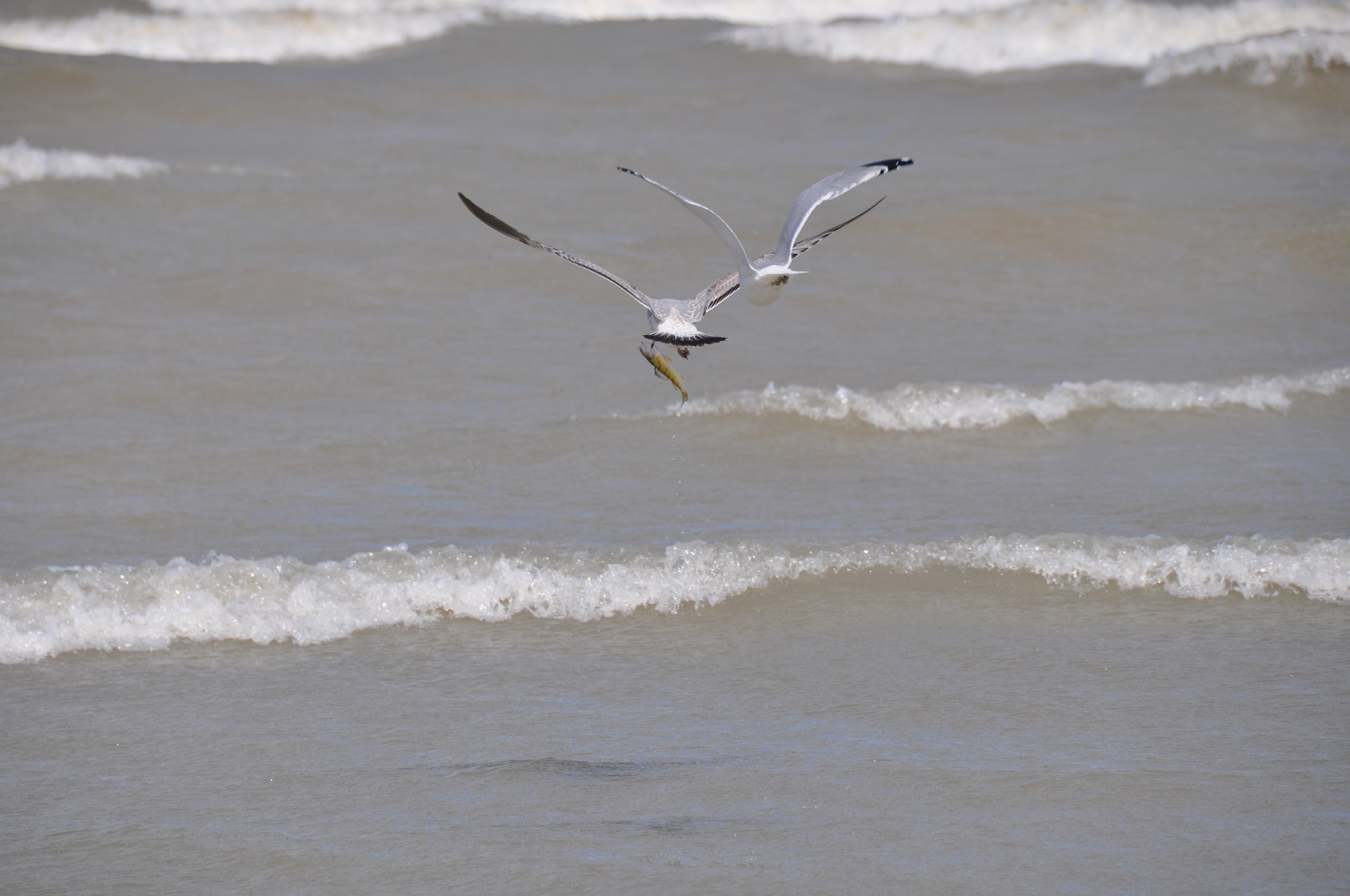 Taken at the Montrose Beach. Two Seagulls fly off to eat after they catch a fish.