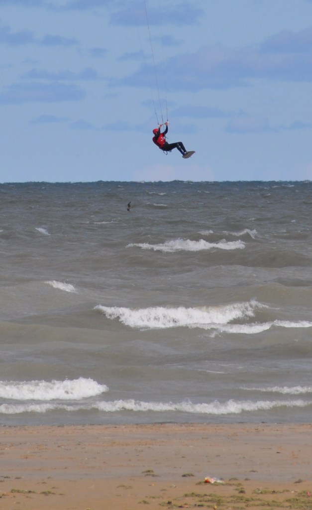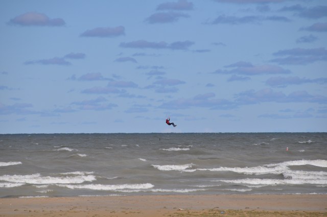 This is a picture of someone kitesurfing at Montrose Beach (Chicago’s Kite Beach) on a windy day. The ban on kiteboarding was lifted on a test basis starting Labor Day 2004 as an “at-your-own-risk” activity and was evaluated in the Spring of 2005 and opened full season starting summer 2005.