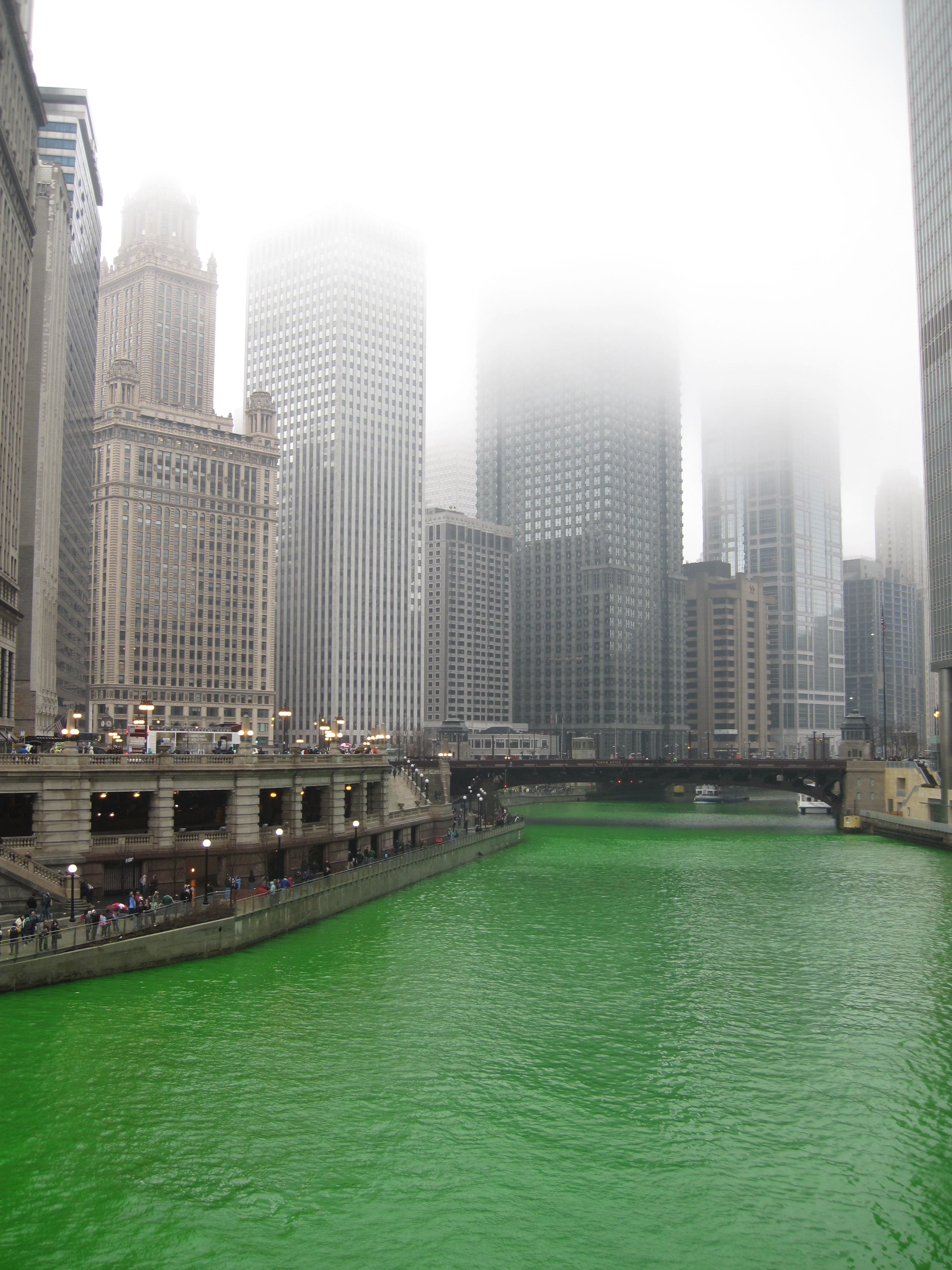 As many of you Chicagoans know, today is the St Patty’s Day celebration which includes the annual Chicago River Dyeing. This has been occurring in Chicago for the past 43 years and is soley contributed to the efforts of Steve Bailey. Steve Bailey was the Business Manager of the Chicago Journeymen Plumbers Local Union #110 and chairman of the St Patrick’s Day loop parade from 1958 until his death November 15, 1966. This all came about when a local plumber had come in to see Bailey wtih his white overalls dyed green from trying to find a leak into the river. After many trials of how much dye to use and concern from enviornmentalists on the type of dye that is used, 40lbs of a vegetable-based dye is currently used to dye the Chicago River a perfect shade of Irish Green for a day. If you haven’t seen this spectacular site, I highly recommend it. This year the river dyeing will happen at 10am. This picture was taken last year after the river had been dyed Irish Green. Note: On a sunny March day the river seems to glow with Irish Green…
