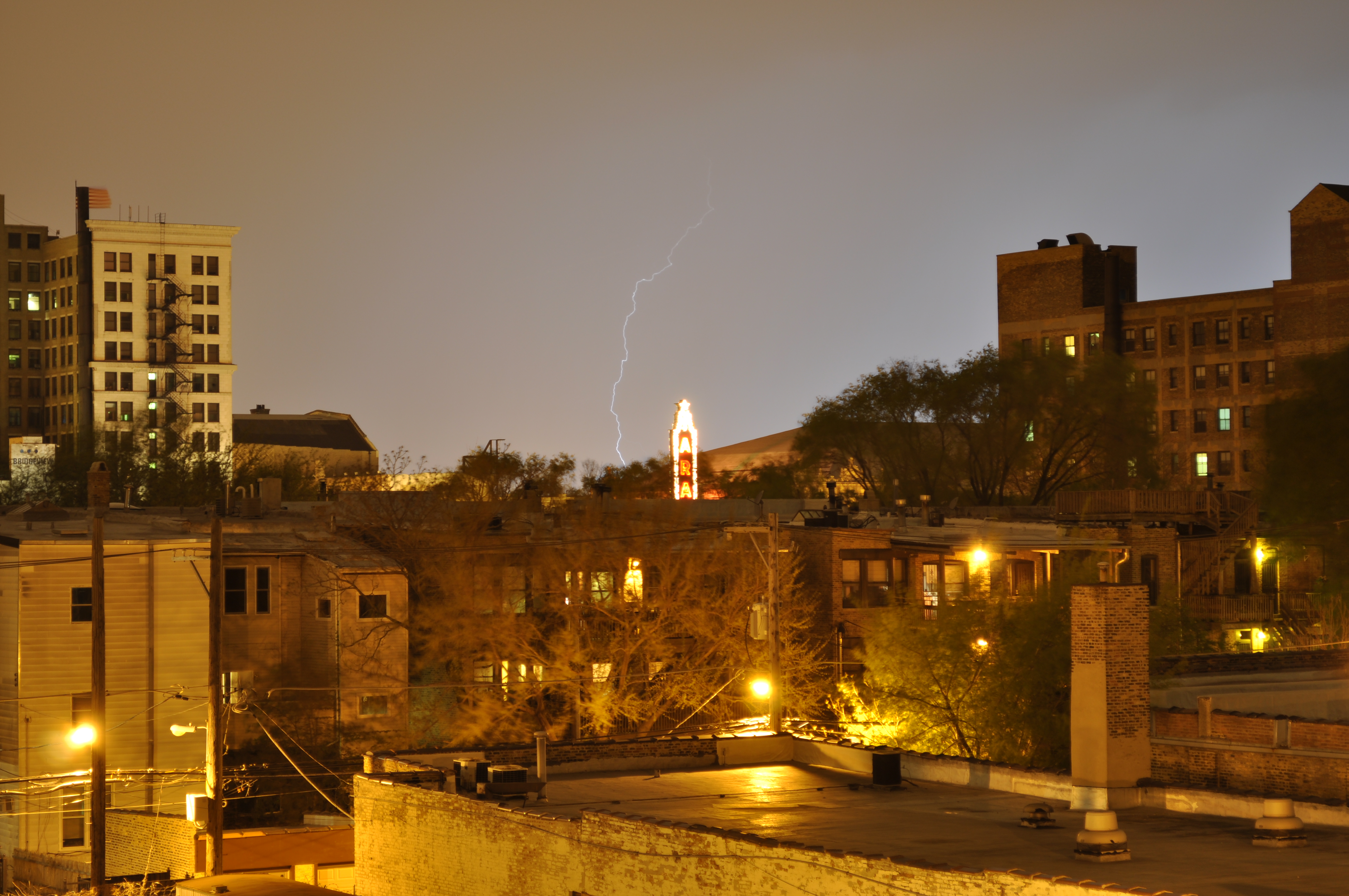 I definitely enjoy watching and photographing storms. Here is a storm that I caught some good photos of from the balcony in Uptown. You can see the lightning striking in the background–something that is difficult to catch on film, but quite rewarding when you do.