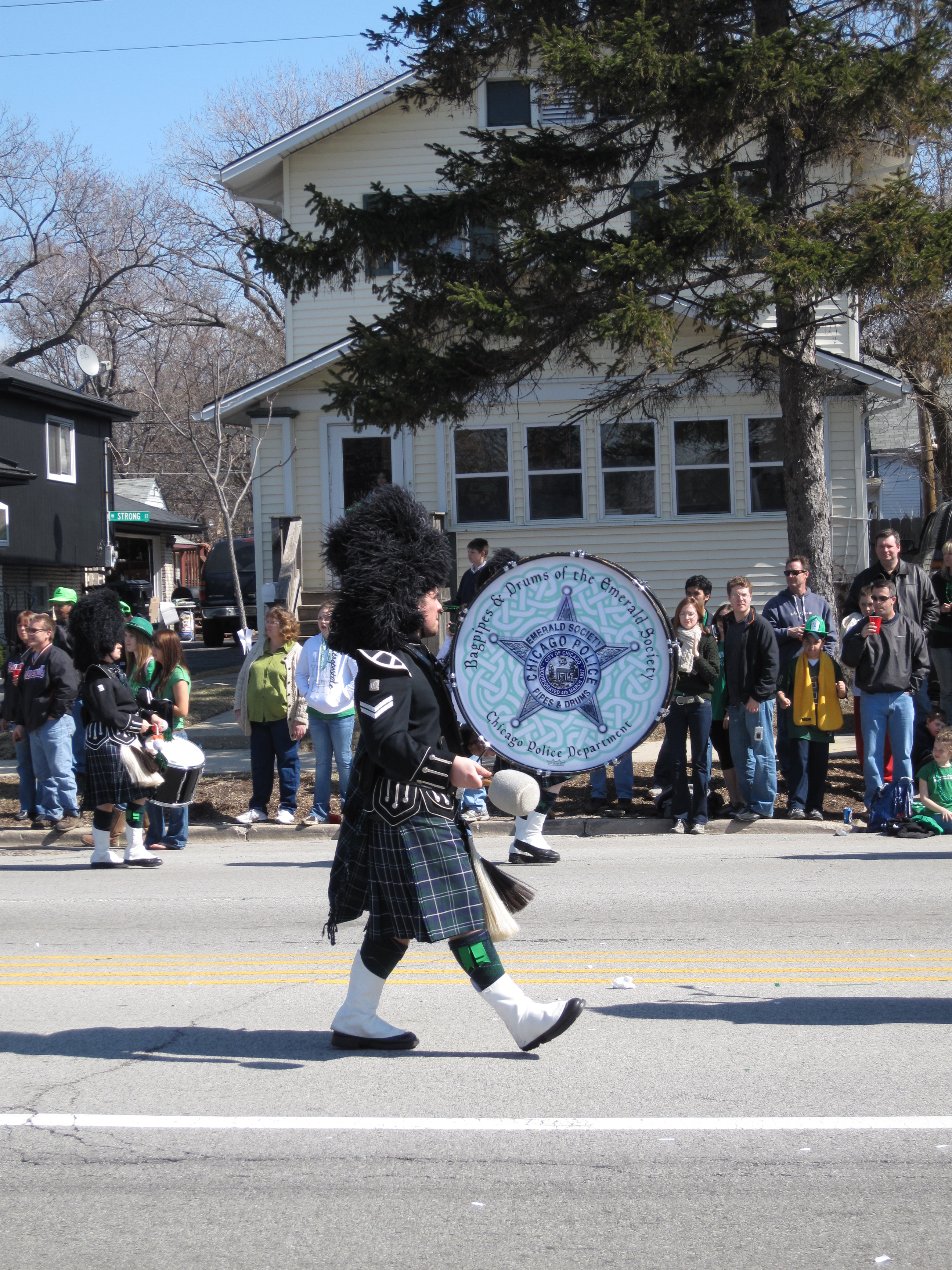 This photo was taken of the Emerald Society marching in the Southside Irish Parade. Each year they used to participate in the Chicago Southside Irish Parade, until it was cancelled in 2010. The parade was started in 1979 by the Hendry and Coakley families and eventually became beloved to thousands. It was cancelled in 2010 due to the strain managing the 300,000+ spectators had on the town resources.