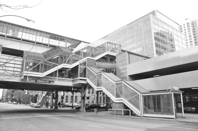 Out one day on a photo walk (as I call those days where I grab my camera and head out with no specific destination in mind but to snap a few good shots) this El stop caught my eye. This is the Clinton stop (also known as Clinton/Lake) for the green and pink lines. It opened in 1909 and was completely rebuilt in 1996 during the Green Line Rehabilitation Project. I really like the structure for this stop and just find it great to photograph.