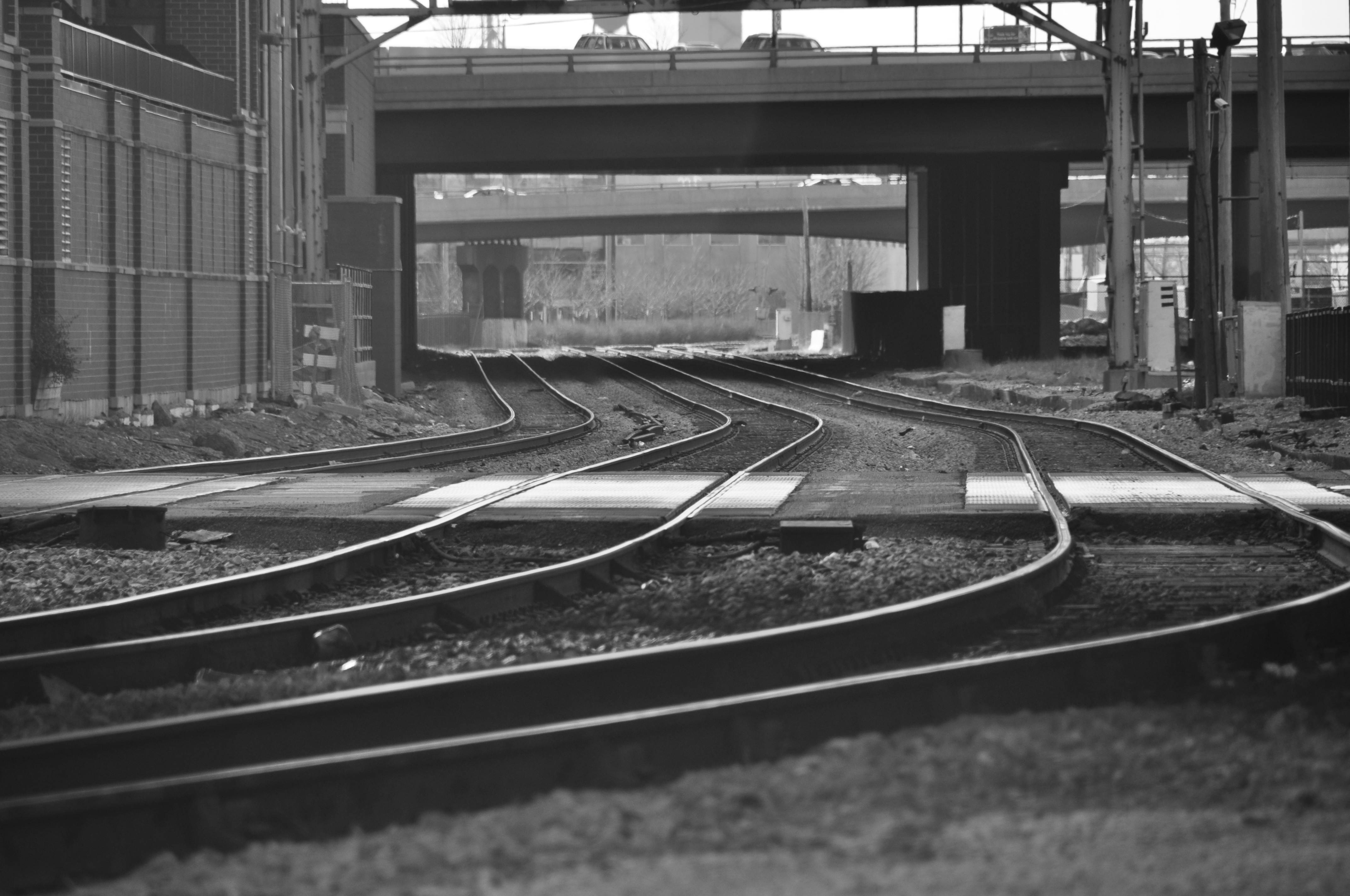 These are the railroad tracks that cross the Kinzie Street Railroad Bridge. They are a spur line of the Union Pacific Railroad, that branches off from the route of the Union Pacific/North Line about 1 mile north-west of the bridge. The picture shows the railroad tracks to the east of the bridge that have been retired since 2000. Funny how the tracks that were so important and so many things depended on can become abandoned and left alone and practically forgotten already.