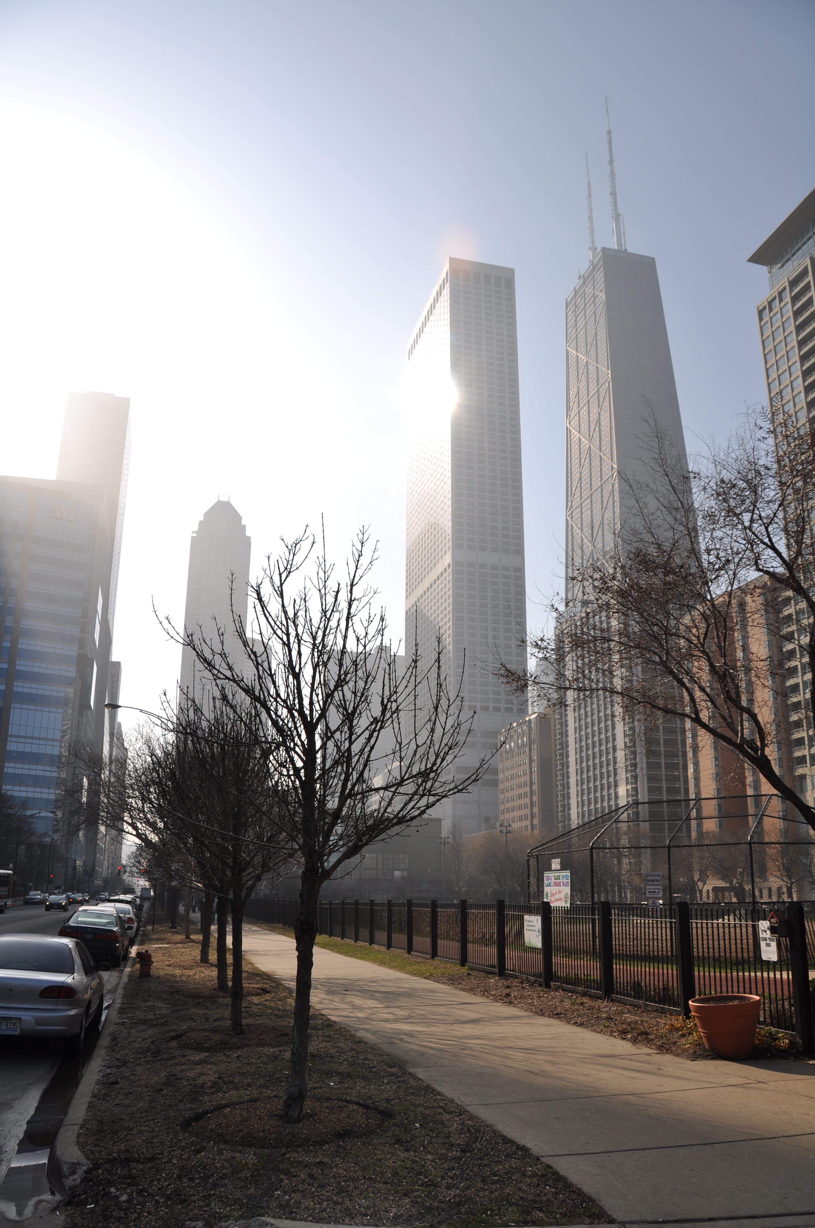 This was taken from Chicago Ave and Lakeshore Drive (Gold Coast/River North neighborhood) of the sun peeking through the buildings on a foggy day. It was later in the afternoon and the fog was still hovering around much of the city, providing many great opportunities for photos!