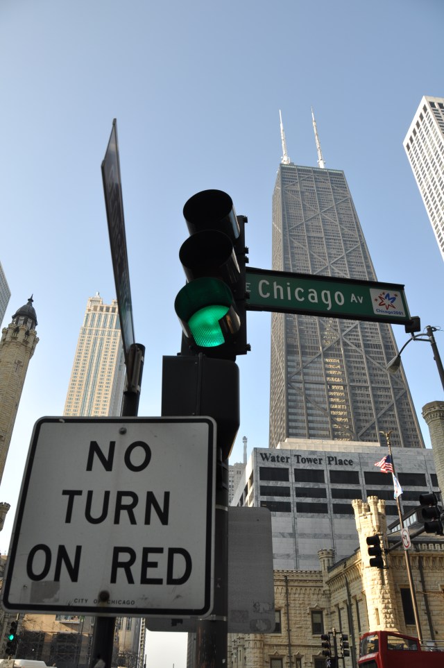 I snapped this shot when I was wandering around downtown one weekend. I feel that the photo captures the life of the city: the old water tower, the water tower shopping center, the John Hancock building and the city skyline, a stop light and a No Turn on Red sign. Pretty much covers it all.