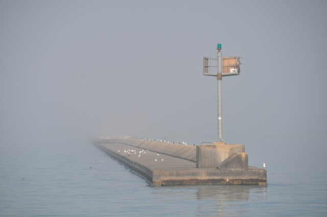 This photo was taken along the lakefront path just north of Chicago Ave late in the day while the fog was still low and covering the city. Usually you can see the rest of the breakwater in the water but with the fog it’s lost in the mist.