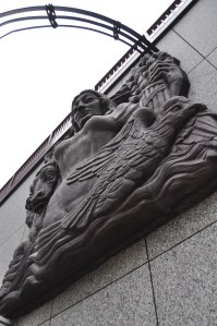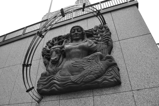 Milton Horn’s bronze bas-relief is symbolic of the city of Chicago. The female figure represents Chicago emerging reborn from the bottom of Lake Michigan following the Great Chicago Fire of 1871. The sheaf of wheat, bull and eagle reference Chicago’s historic role as a center of commerce, the livestock market and air transportation, respectively. Floral forms evoke the city motto, “Urbs in Horto” or “City in a Garden.” Finally, the bronze ring arching across the relief represents Chicago’s central geography within the United States.