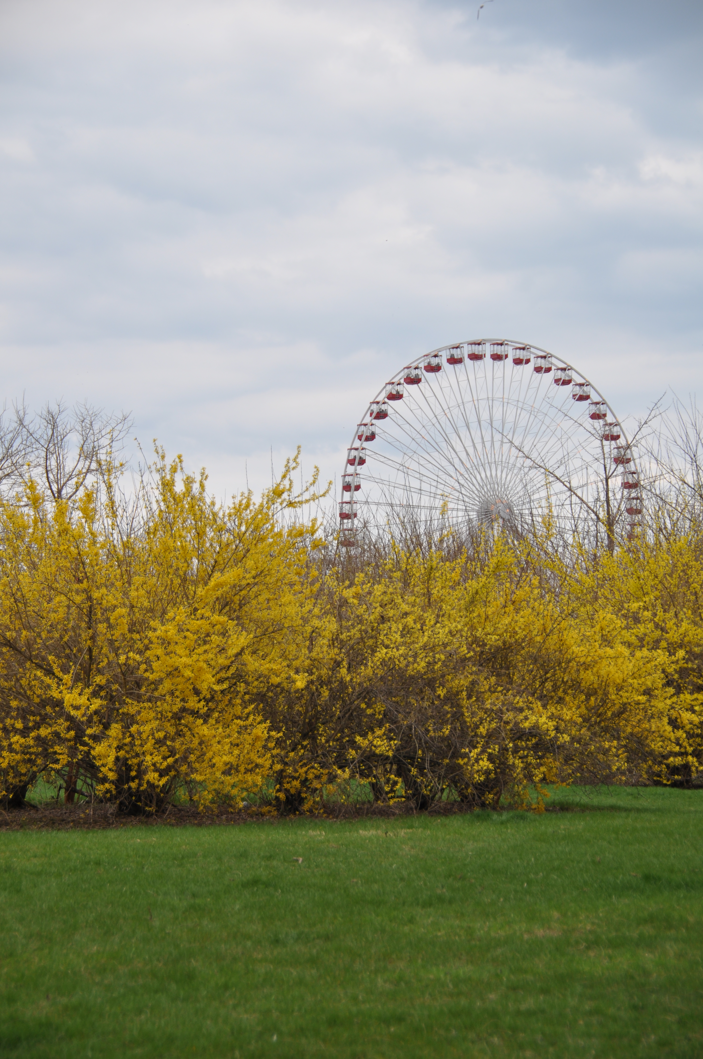 From the Milton L. Olive III Park, here is a photo of the ferris wheel at Navy Pier. The yellow flowering bushes showcase that spring is finally here.