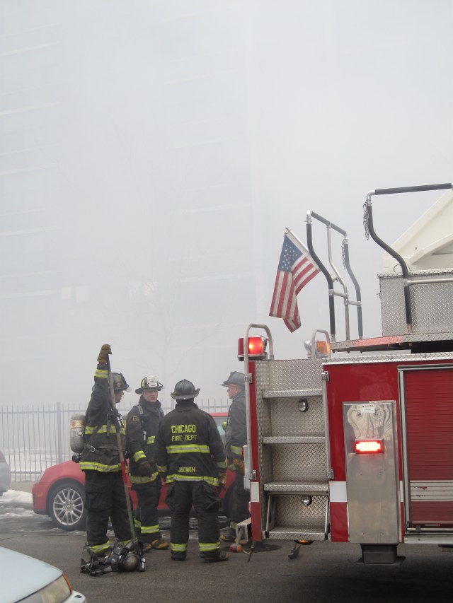 A group of Uptown fire fighters fighting a generator fire on a side street in Uptown.