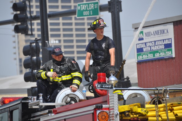 The firefighters of the Chicago Ridge fire department and the Chicago Ridge Engine 6533 Sutphen Pumper in action. This was one of the demonstrations from the Muster at the Chicago Fire Academy festival.