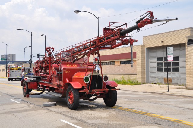 This is the Water Tower No. 2. One of 3 left in Chicago, this truck was in action from the mid 1920’s- late 1960’s and can be seen on display at the Fire Museum of Greater Chicago. This truck has no pumps so it relies on other engines to pump the water to the truck. Requiring a hand crank to lift the nozzles into place, the Water Tower can spray as much water as about 4 single trucks.