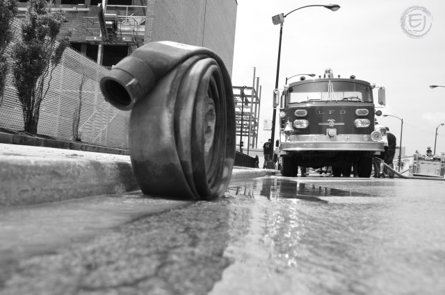 A lonely firehose sits all rolled up at the curb during a demonstration at the Muster at the Chicago Fire Academy last weekend.