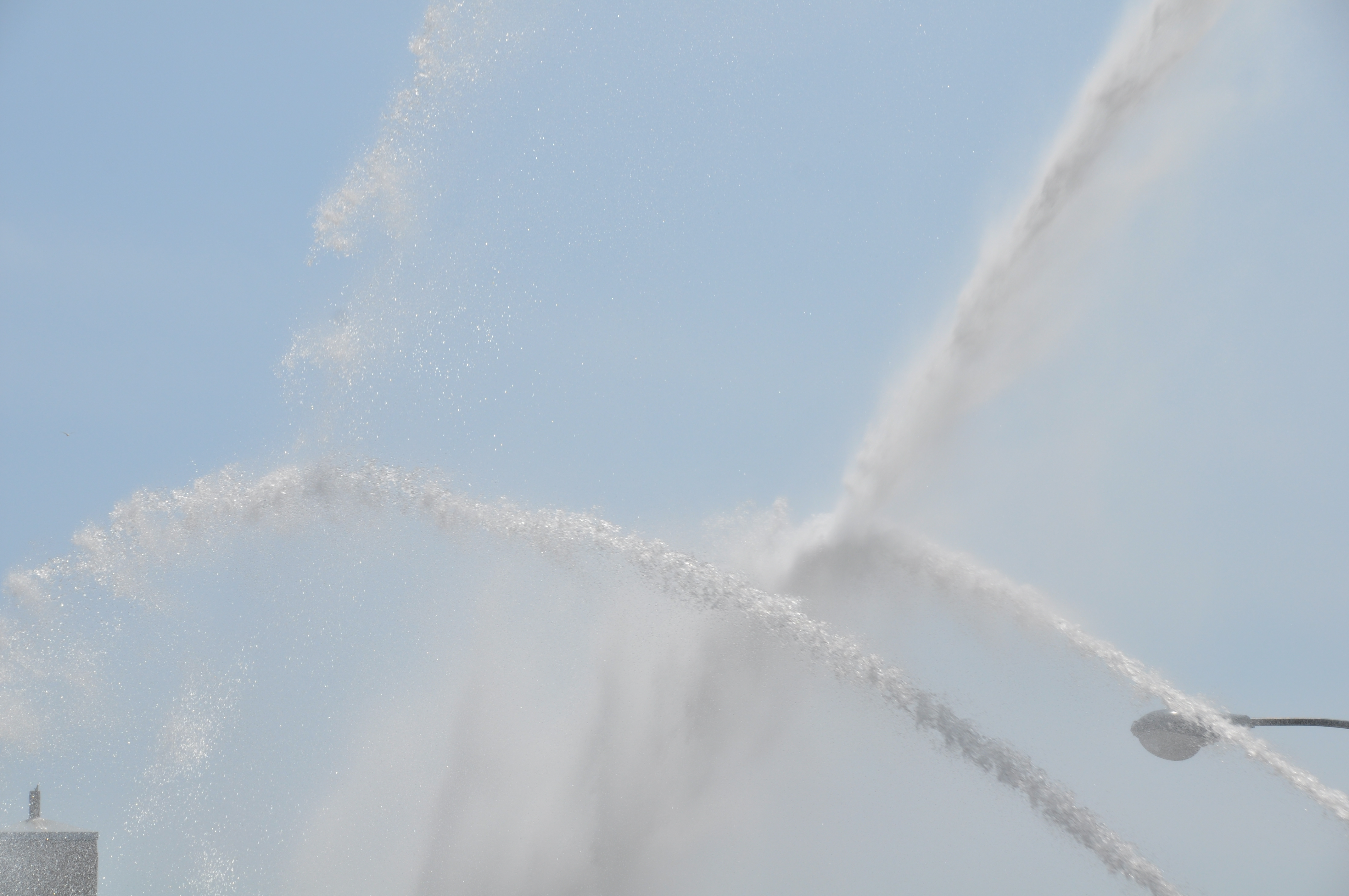 This is a photo of the streams of water crossing from two separate fire trucks during a demonstration at the Chicago Fire Academy.