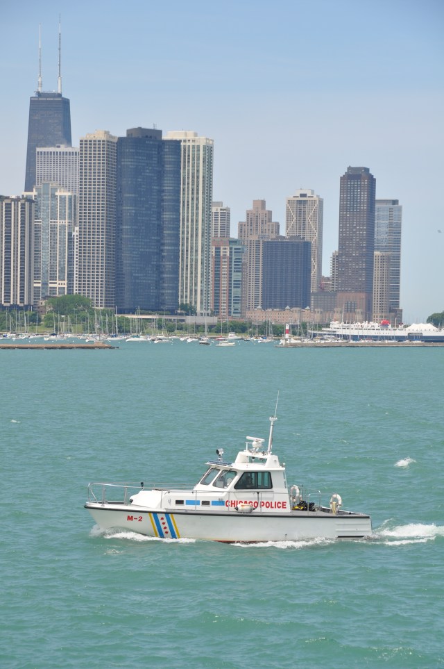 The Chicago Water Police patrol Lake Michigan near the Lakefront path behind the Shedd Aquarium.