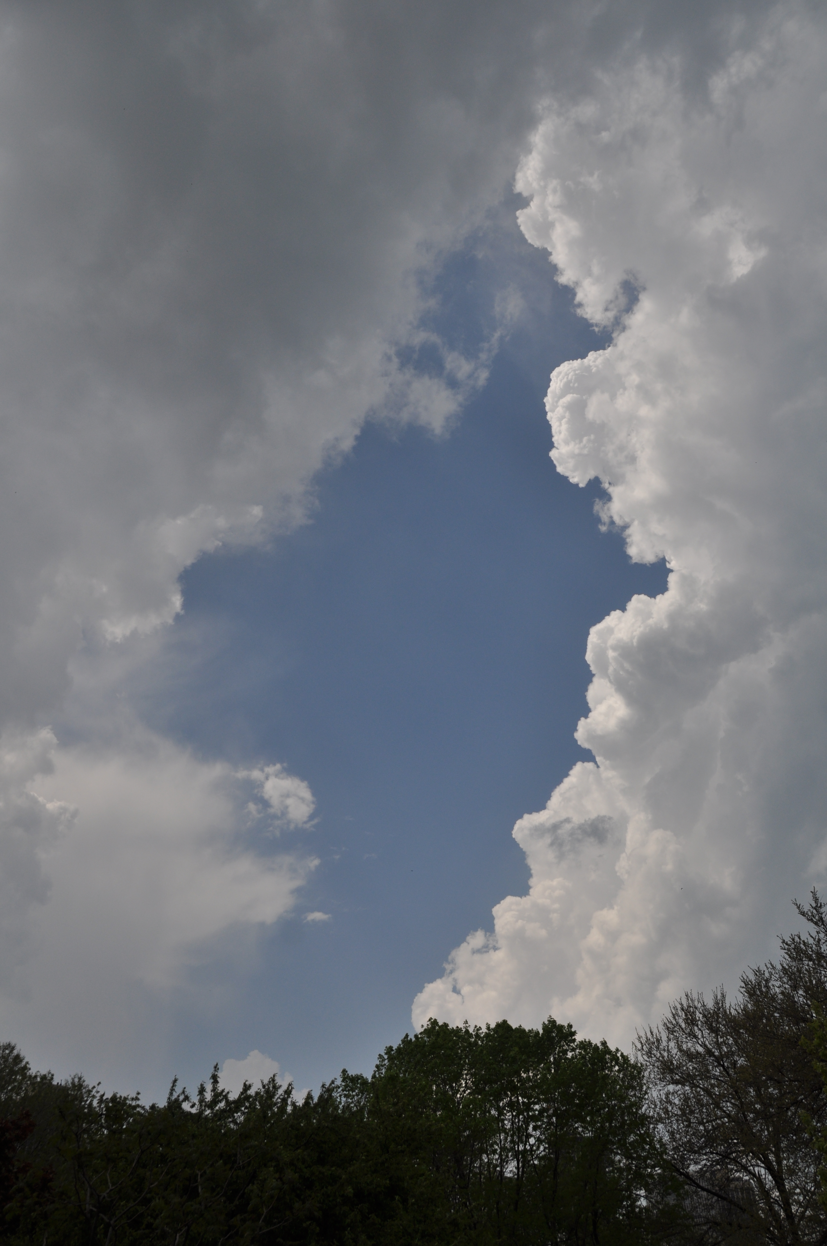 A blue sky peeks through an opening in the clouds.