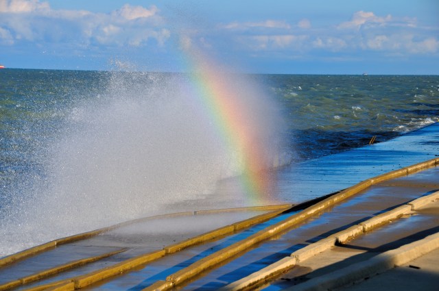 As the waves of Lake Michigan crashed along the lakefront trail near Belmont Harbor I snapped this shot and caught a view of the rainbow in the mist.