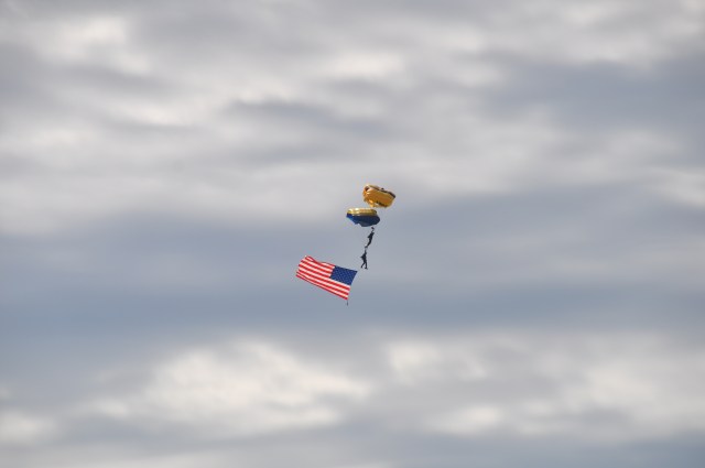 The jumpers typically open their parachutes at around 5,000 feet by releasing a smaller pilot chute which deploys their main blue-and-gold canopy. These jumpers hooked together after opening their parachute and displayed the American flag as America the Beautiful played.
