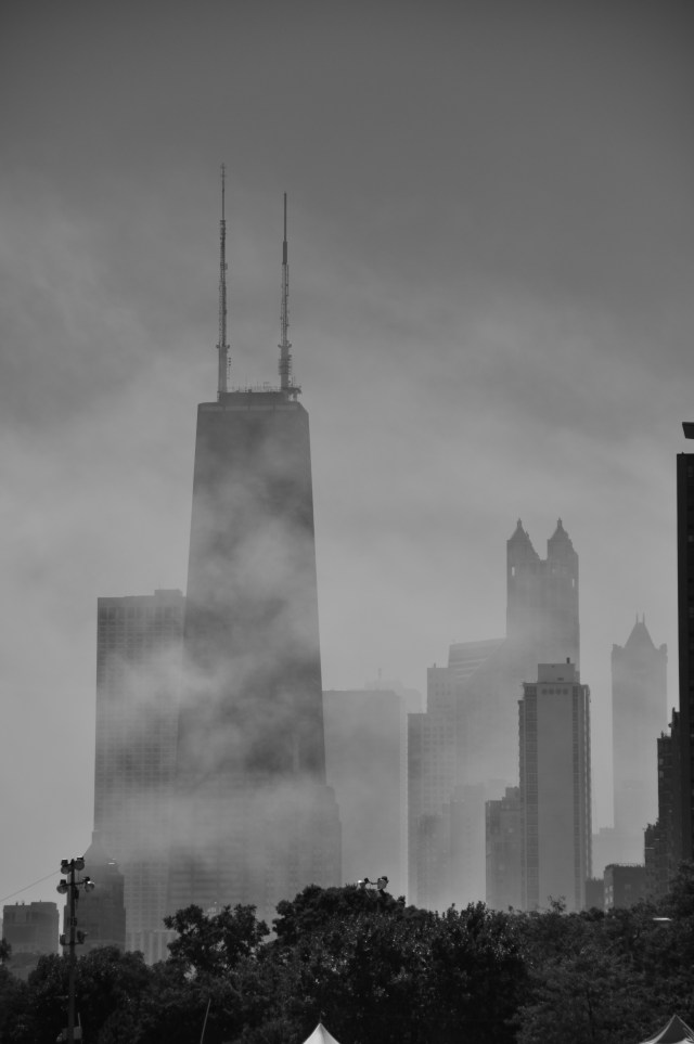 A view of the city engulfed in the smoke from the planes and jets at the Air & Water show.