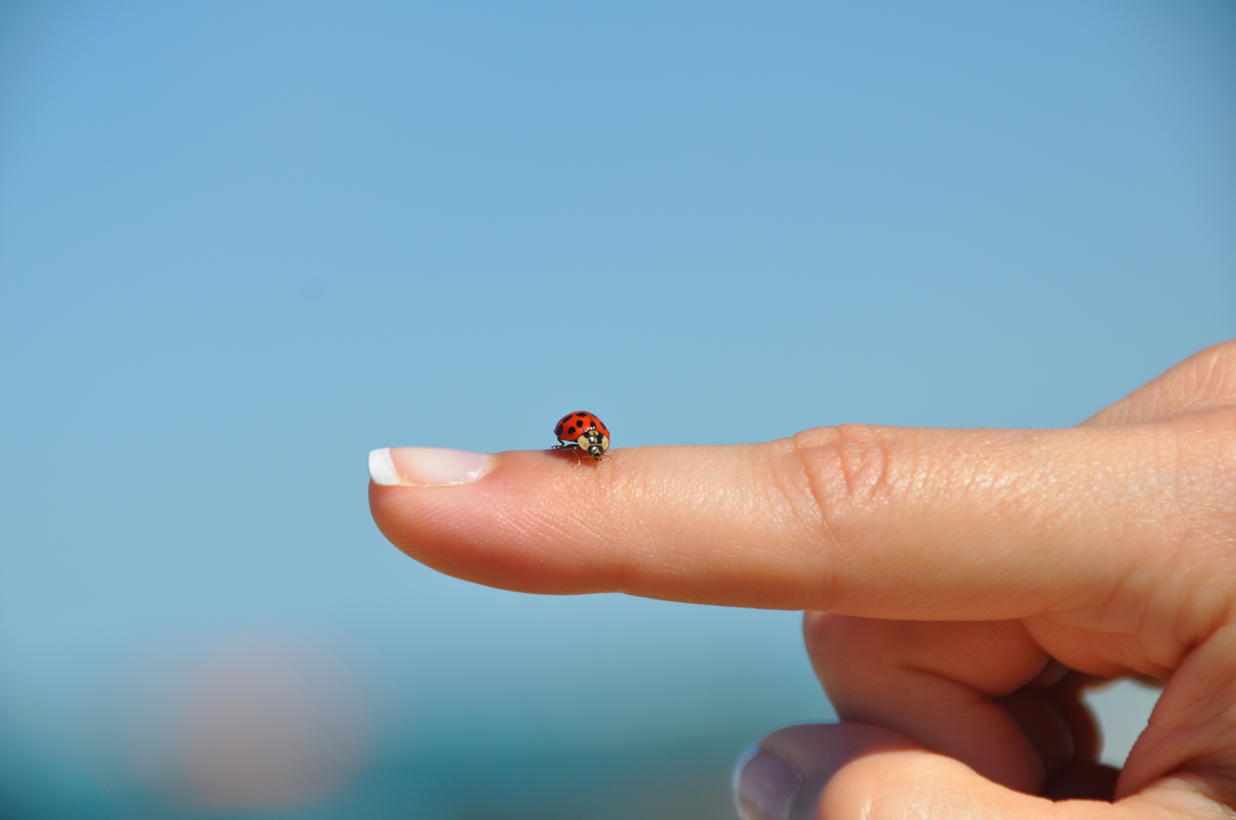 A lady bug lands on a finger to pay us a visit at the beach.