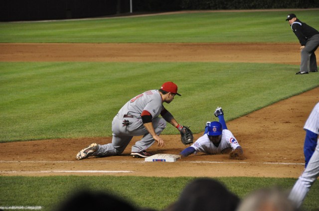 Cubs rookie outfielder Tony Campana slides into first and is called safe as First baseman Joey Votto of the Cincinnati Reds tries to make a play.