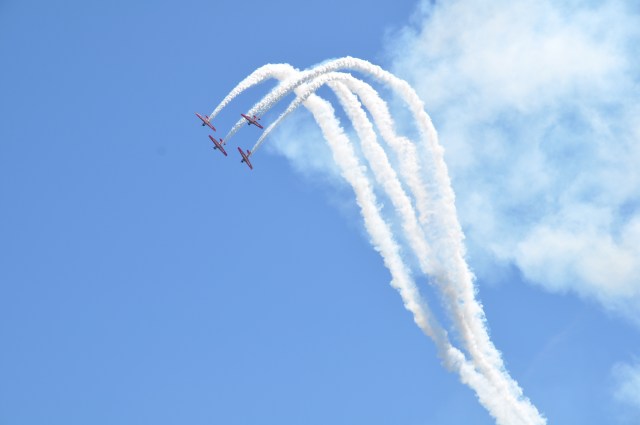 Smoke fills the sky as the Aeroshell Aerobatic Team takes the sky at the Air & Water Show in Chicago.