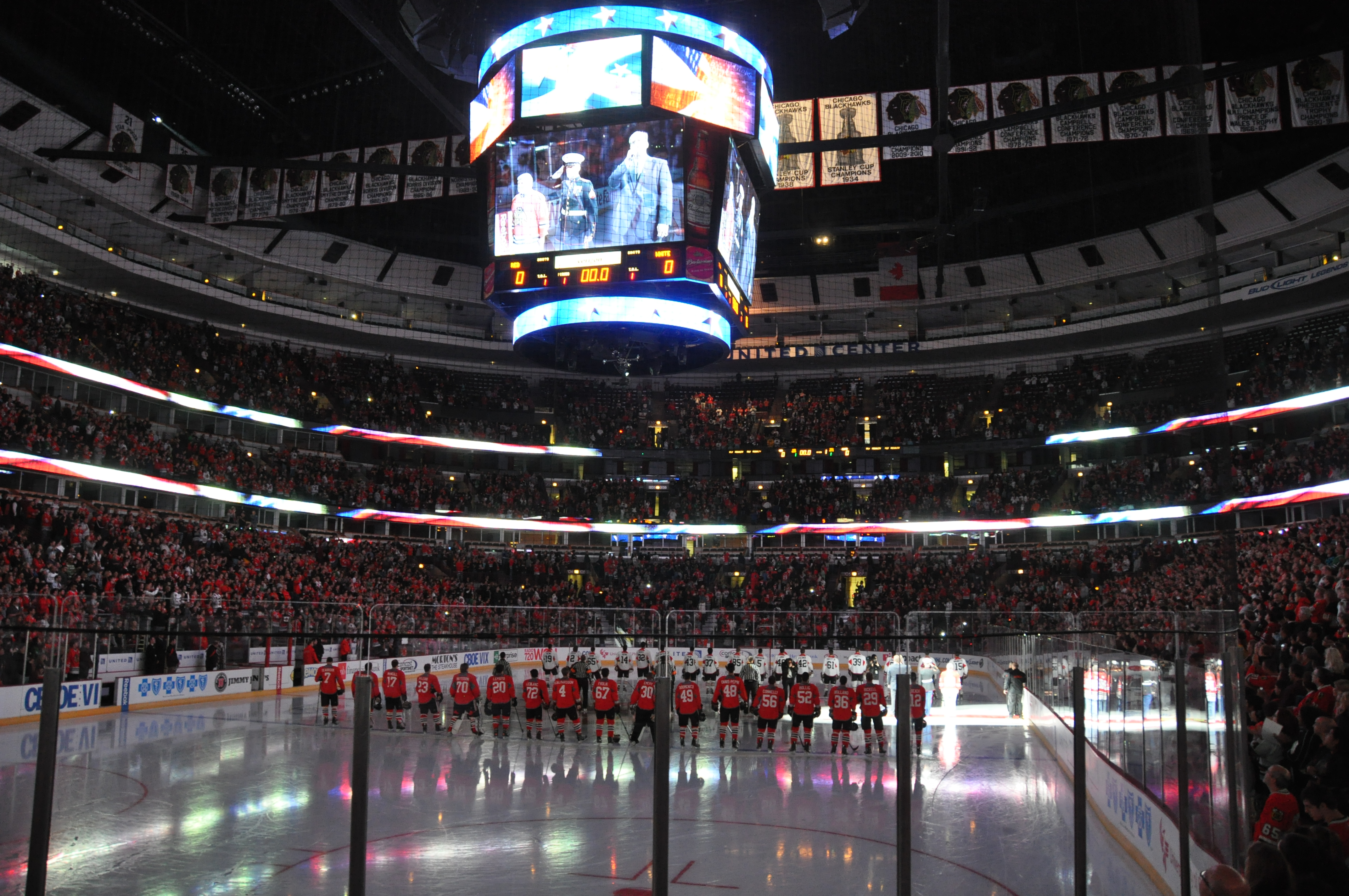 Blackhawks Team A and Team B line up to hear the singing of the National Anthem sung by Jim Cornelison.