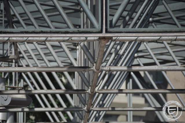This is the metal truss framework that supports the glass roof canopy spanning over the outdoor eating area in the River Plaza between the Trump Tower and the Wrigley building. It also happens to be outside of a McDonalds.