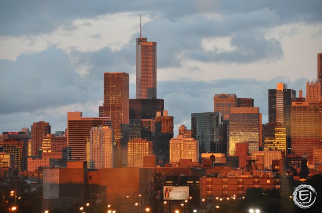 A view from the United Center as the sunset reflects on the skyline.