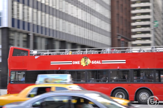 This is an old one, but in honor of the Blackhawks first regular season game tonight at Dallas I decided to reach into the vault and post a picture that I captured during their race to the cup in 2009-2010 season. I like this photo so much as it is uniquely Chicago in the way that the whole city fully backs their sports teams by donning the brontosaurus with a Blackhawks jersey, Picasso with a hockey helmet and modes of transportation with the icon Indian head logo of the Blackhawks.