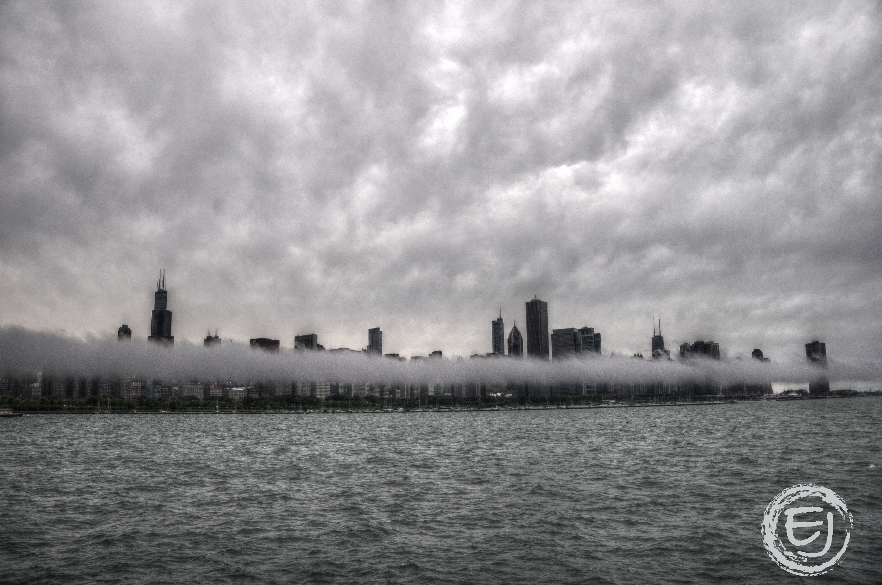 In lieu of today being a dreary, cloudy and rainy day, here is an HDR photo from the Lakeshore path of the fog rolling in over the skyline. HDR really shows the detail in the clouds and waves in the lake.