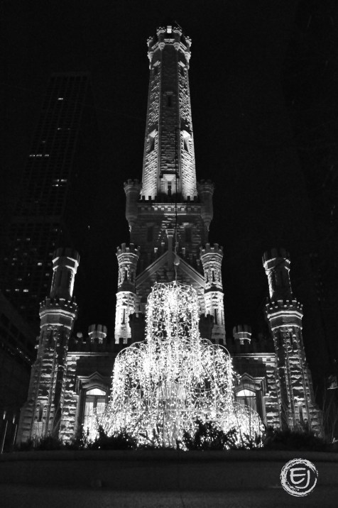 The Water Tower downtown Chicago decorated for Christmas.