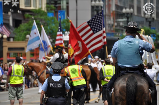 The mounted color guard presents the flag to kick off the Chicago Memorial Day parade.