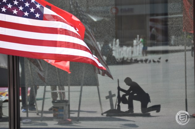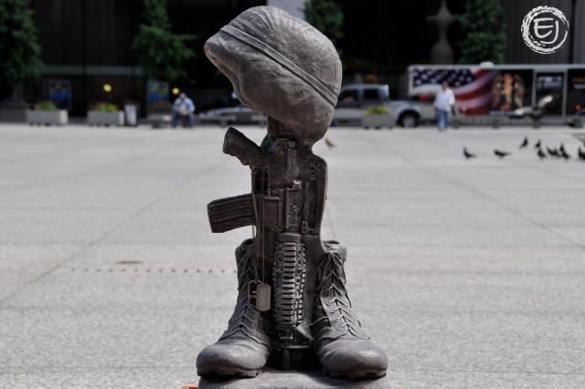 Reflecting in the windows of the Daley Center was the silhouette of a statue showing a soldier mourning the loss of a brother in battle. The statue, flags and memorial wall showing the photos and names of all Illinois fallen soldiers were all set up in Daley Plaza by the Illinois Patriot Guard Fallen Heroes Traveling Memorial Walk.